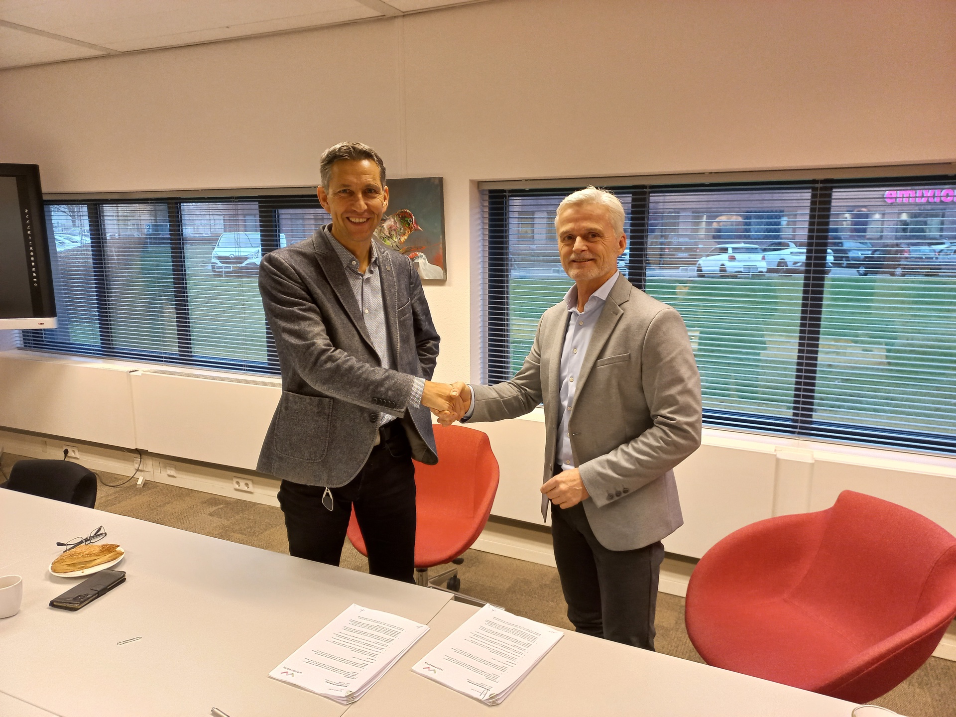 Directeur-bestuurder Antoine Pekel (links) en John de Beijer van Giesbers Bouwen en Ontwikkelen tekenen voor 49 nieuwe sociale huurwoningen.